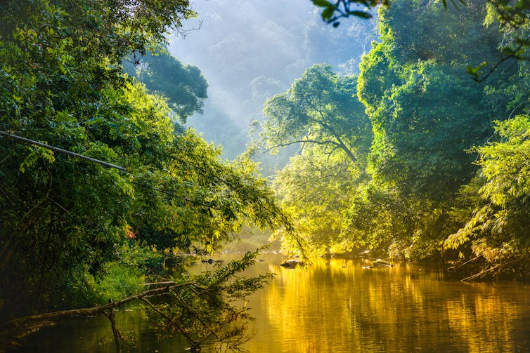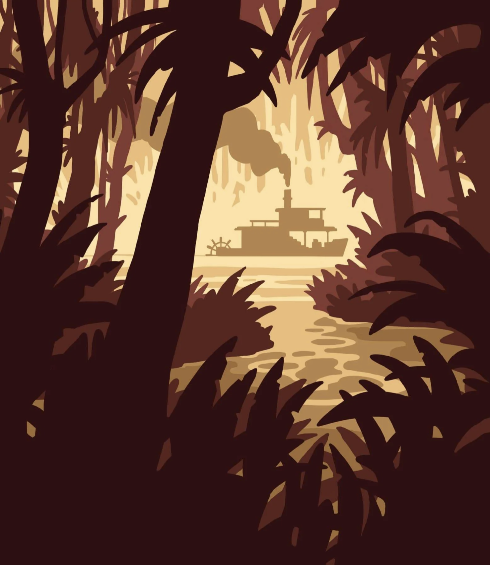 Let's imagine an atmosphere of dense heat, humid as hell, where you can't even sweat. On both sides of the river stands an infinite rain tree forest, so dense, that you can't see anything behind the first meters.